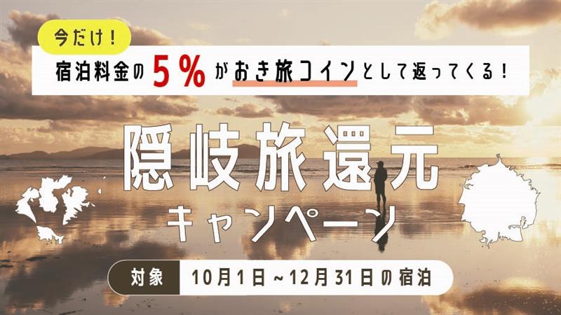 冬の隠岐をもっとお得に楽しんでいただきたく、本サイトから2025年10月1日(水)~2025年12月31日までの期間の宿泊施設のご予約をいただいた方全員に宿泊料金の5%分(端数切捨)をおき旅コインでプレゼントしています。