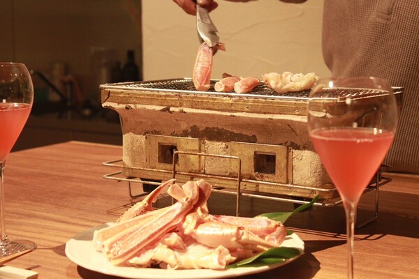 冬の日本海を代表する高級ブランド「松葉ガニ」。新屋敷では、お一人様につき一杯を、茹でや焼きだけにとどまらず、本格イタリアンの技法で仕立てた「蟹フルコース」で提供しています。さらに、料理人はソムリエでもあり、コースに合わせたワインペアリングもお楽しみいただけます。