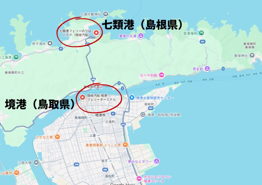 本土には七類港(島根県)と境港(鳥取県)の2つの港があります。どちらの港に発着するかをよく確認して、スムーズに移動ができると安心ですね。 また、空港や駅から港までは使える交通手段が異なることもあるので注意しましょう。