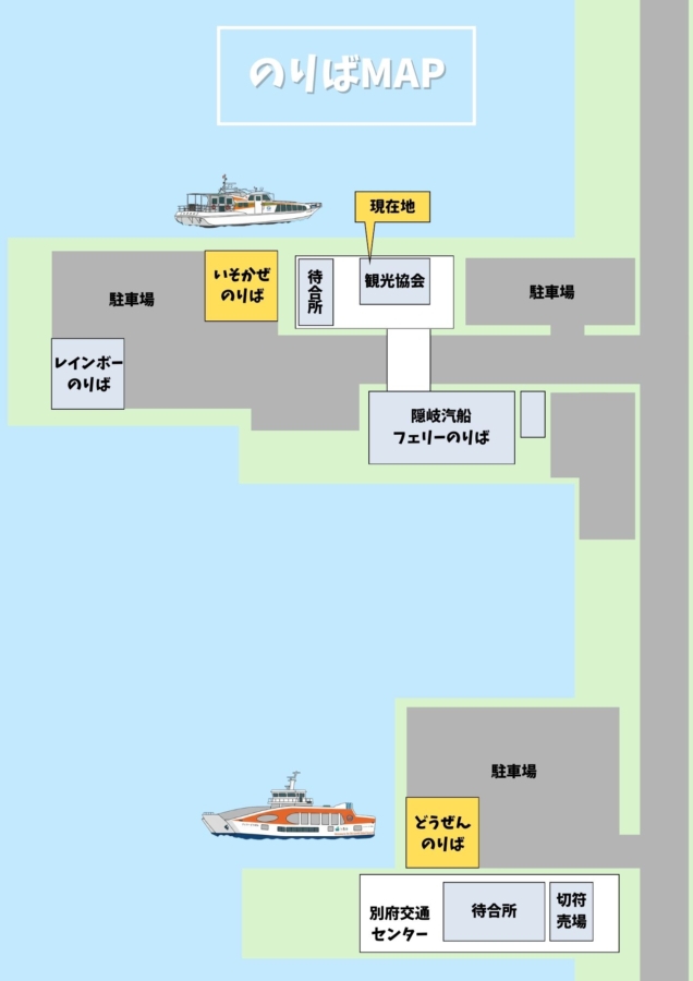 本土と隠岐をつなぐフェリーと高速船、島前3島をつなぐ2つの内航船の乗り場はそれぞれ違い、合計で4つの乗り場が存在します。すべて別府港に乗り場がありますが、歩いて数分かかる距離ですので、事前に場所を確認していくと安心です。