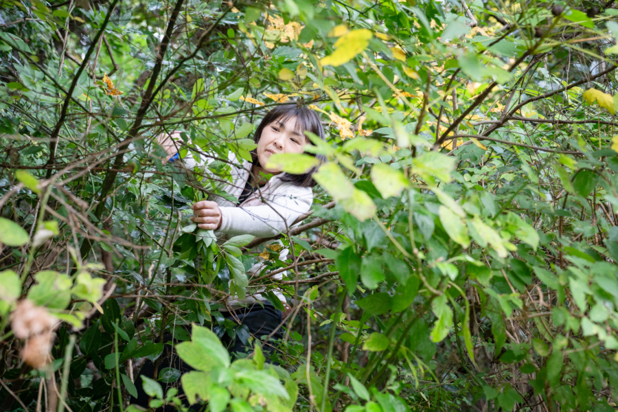 取材中の彼女は、とにかくよく立ち止まり、迷いなく森の中へ分け入っていく。「見てください、あそこ」と指差す先には、高い木に絡みついた太いツルと、そこにぶら下がる赤紫色の実。