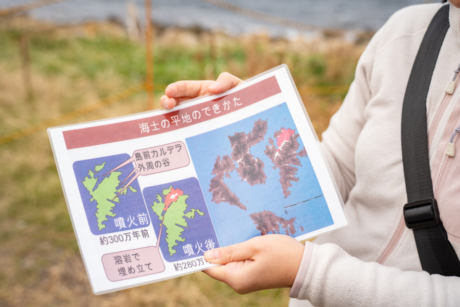 「答えは、280万年前の火山活動にあるんです。海士方平野とよばれるこの場所は、約630〜530万年前に活動した大きな火山によって島前カルデラが生まれた当初、深い入り江だったと考えられています。その後、約280万年前に明屋海岸で再び火山活動が起こり、粘り気の少ない溶岩が海へ流れ出して冷え固まり、平らな台地をつくりました。さらに、その奥に残った窪地には水がたまり、やがて広大な湿地が生まれたんです」