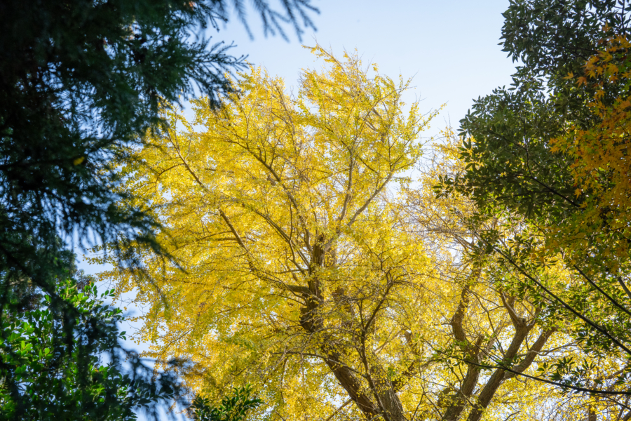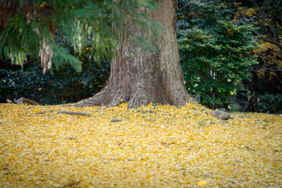その余韻に浸りながらふと見上げれば、季節は秋。境内にあるイチョウが、鮮やかな黄金色に染まり、風が吹くたびに金色の雨を降らせている。足元に広がる黄金の絨毯を踏みしめながら、小澤さんが微笑む。