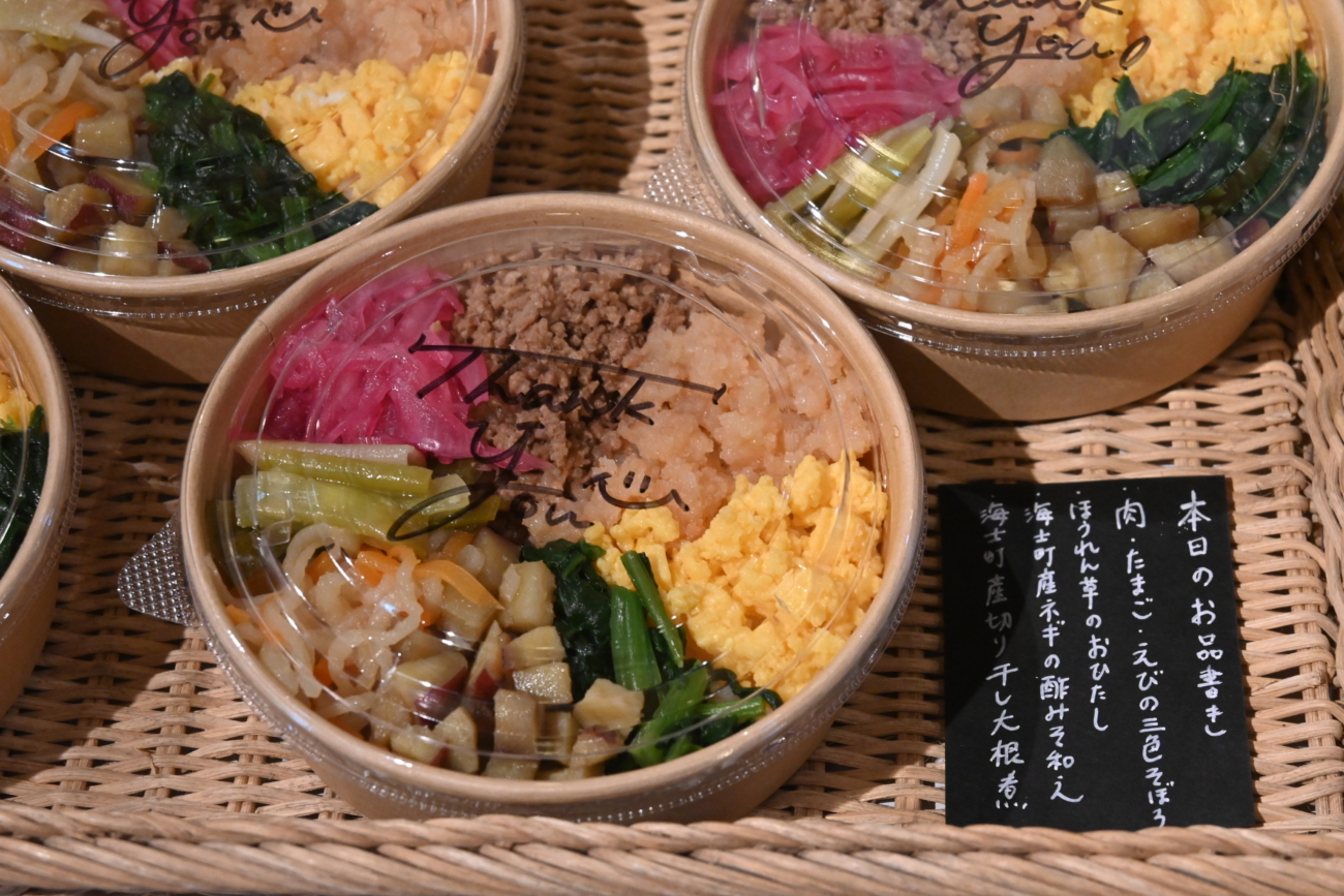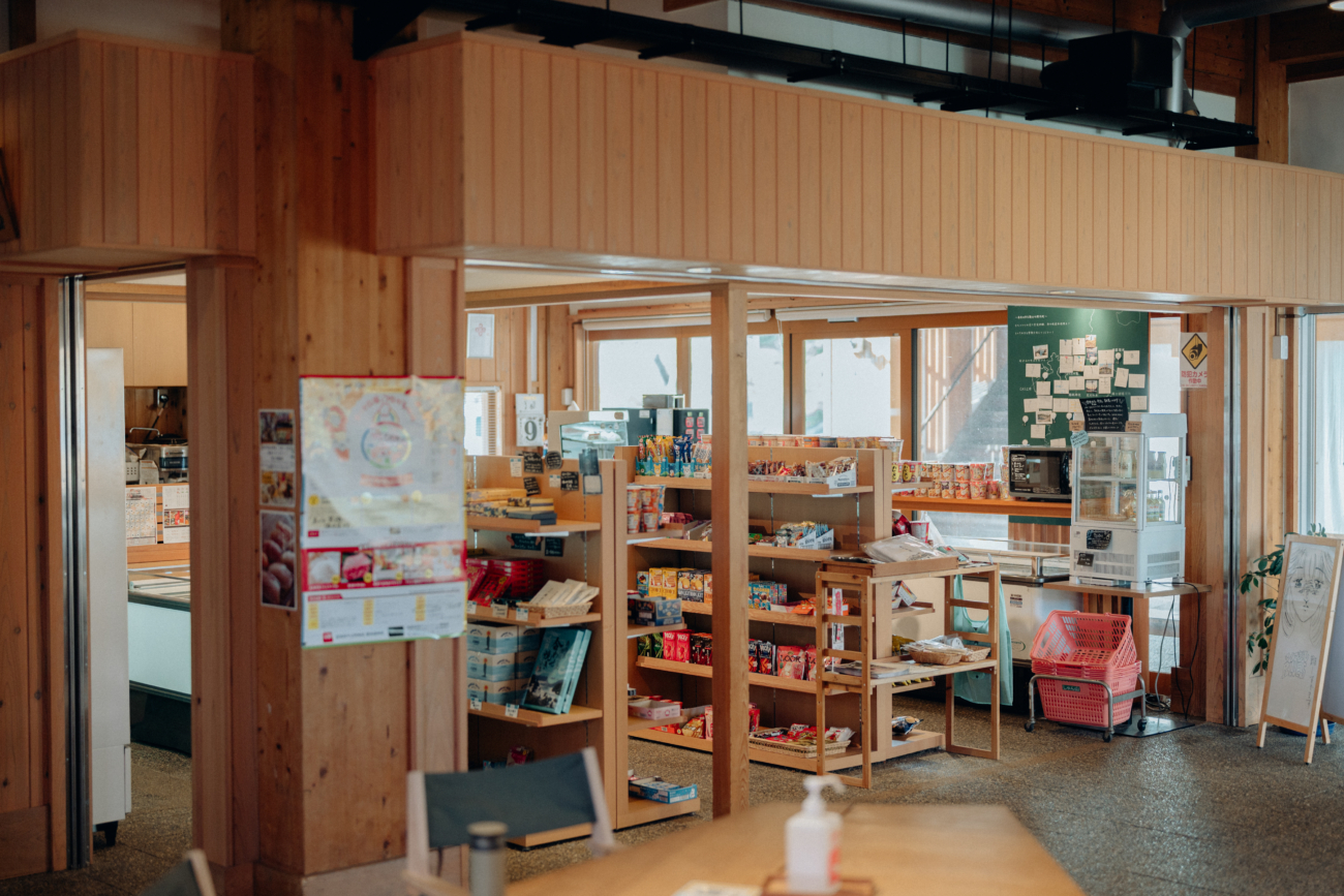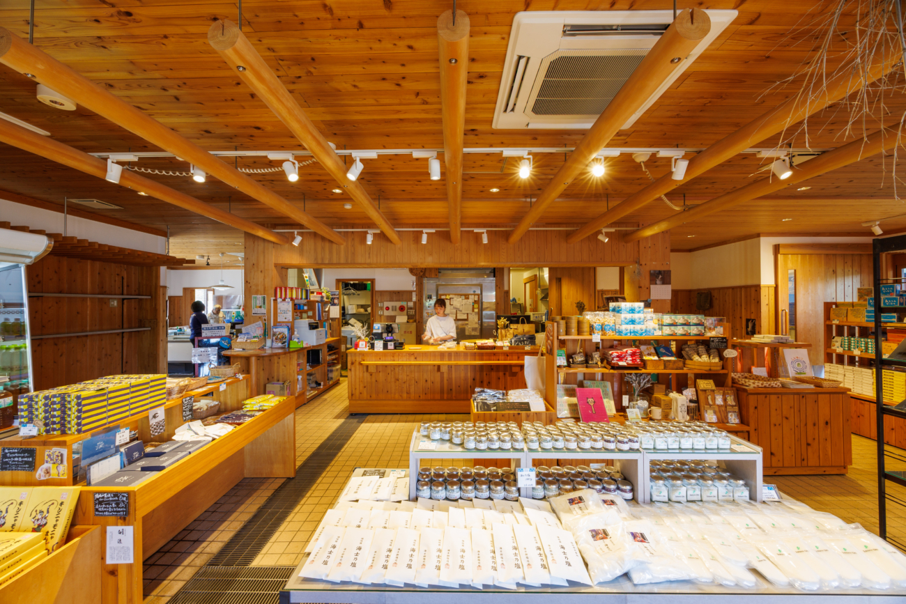 菱浦港のフェリーターミナル「キンニャモニャセンター」内にある「島じゃ常識商店」です。売店側の店舗では、ホットスナックやコーヒーのほか、手作りの日替わり弁当や自家製のおにぎりをご用意しており、島の皆さまにとって憩いの場としてもご利用いただいております。観光やご帰省の際にお立ち寄りいただけるお土産物の店舗では、おつまみやお菓子、雑貨のほか、島にゆかりのある書籍などを取り揃えております。また、地元産の野菜もご購入いただけます。スタッフが目を配り、島にはない珍しい品や、島ならではの魅力的な品も取り揃えておりますので、ぜひお気軽にお立ち寄りください。